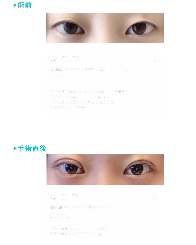 実際の腫れ具合を、湯田眼科美容クリニックで二重埋没法を受けた方の個人投稿インスタグラムでご紹介します。(もちろん許可は得ています)