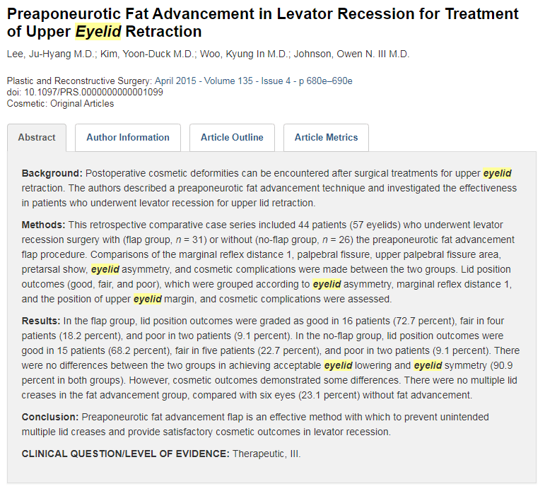 背景:眼瞼後退はたまに起きる合併症です。眼瞼後退に挙筋切除を受けた患者様で、挙筋腱膜上脂肪前転テクニックをおこなった論文を発表します。