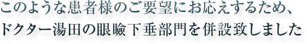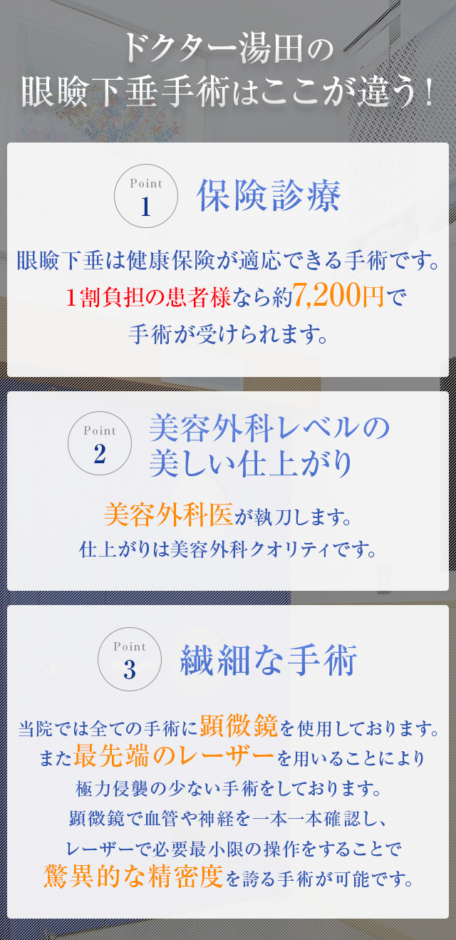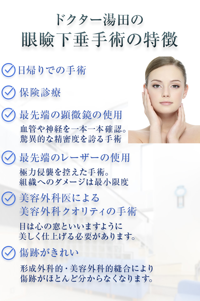 私の眼周りの手術の知識・技術は多くのものが父である湯田兼次医師に伝授して頂いたものです。眼周りの悩みでお困りの方に、眼科・美容外科医・形成外科医の多領域からの専門知識を生かしご提供したいと思っております。